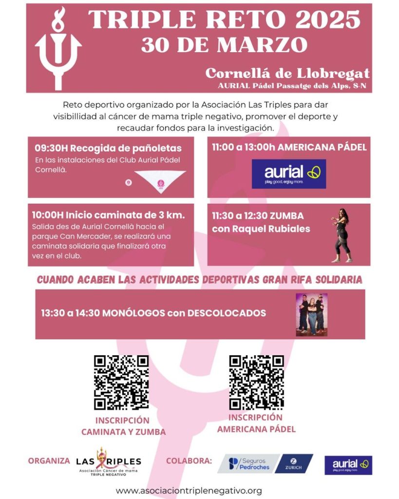 Ya tenemos el cartel definitivo para el TRIPLE RETO que se celebrará en Cornellá de Llobregat. Con la colaboración de AURIAL PÁDEL y SEGUROS PEDROCHE . Con la participación de Raquel Rubiales instructora de ZUMBA y con DESCOLOCADOS que nos harán pasar un rato super divertido. No os podeis perder la gran RIFA SOLIDARIA que […]